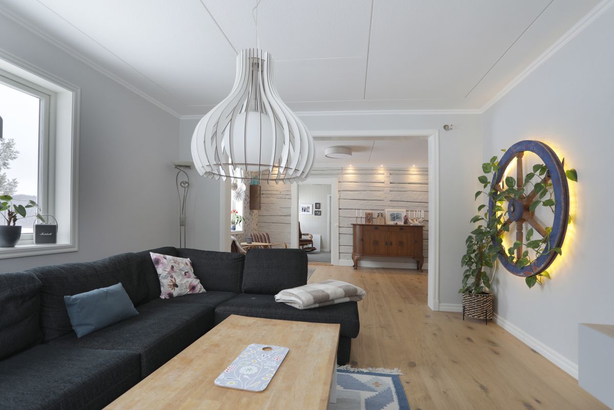 Det gäller att prioritera det viktigaste när man tar hand om ett hus. Det är inte spektakulärt att dränera om och byta tak, men helt nödvändigt för husets hälsa. Att lägga in golvvärme när allt golvet ändå ska bytas är en klok investering som både ger högre komfort och sänker driftskostnaderna. De nya golven är inte bara vackra, utan även varma. Husets sällskapsytor är vackra och funktionella, den framtagna timmerväggen förstärks av smakfull belysning.